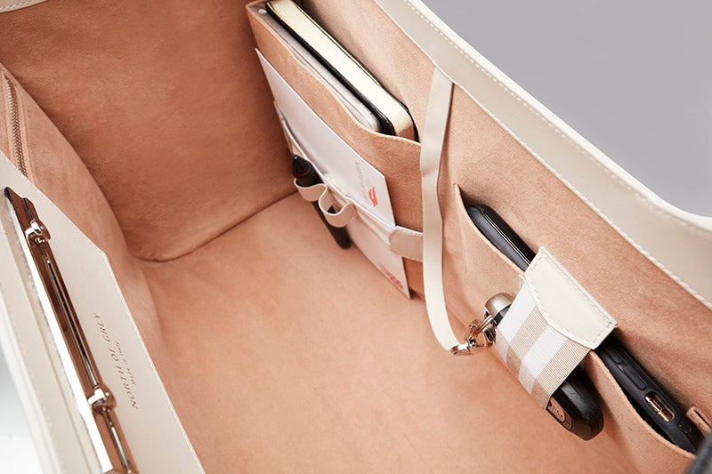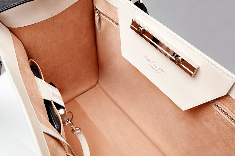 At its core, a warm white structured tote with reserved ebony accents and a smaller Evening Black and Warm White companion bag connect through a patent-pending attachment system that is exclusive to North of Grey. Together or apart, they create a quiet, intelligent statement in modern luxury.