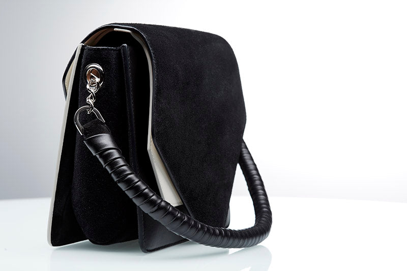 Deliberately scaled, the companion bag carries your immediate essentials with the same precise language of line, texture, and proportion. Evening Black and Warm White leather and suede frame a Nude Alcantara® lining, keeping the palette quiet but defined.